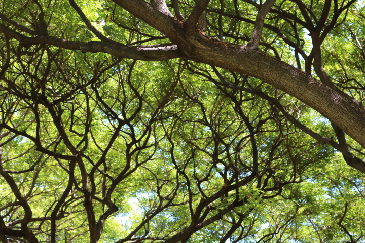 ハワイの木・葉もいろいろ青空にそびえ立つヤシの木バナナの木ガーデンのグリーンなど