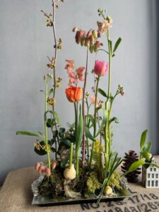 バスケットに球根付きチューリップ