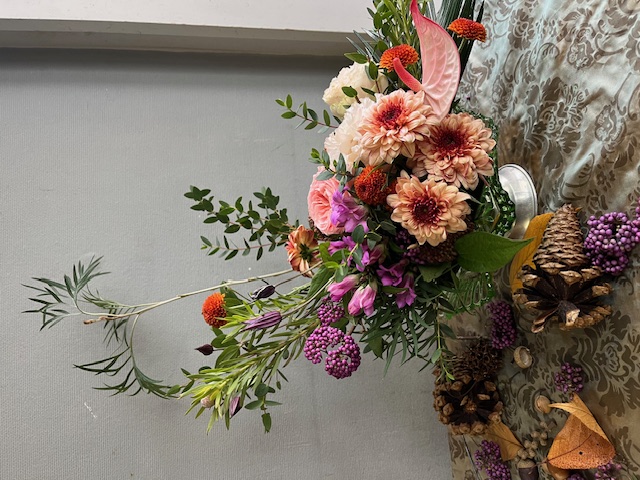 2025/11/19 カラフルなお花を使います MISUMIフラワースタジオ カラフルなお花を三日月形にデザイン カラフル色 バラ 菊 アンスリューム 等を使ってデザインをしましょう カラフルフラワー。クレッセント形