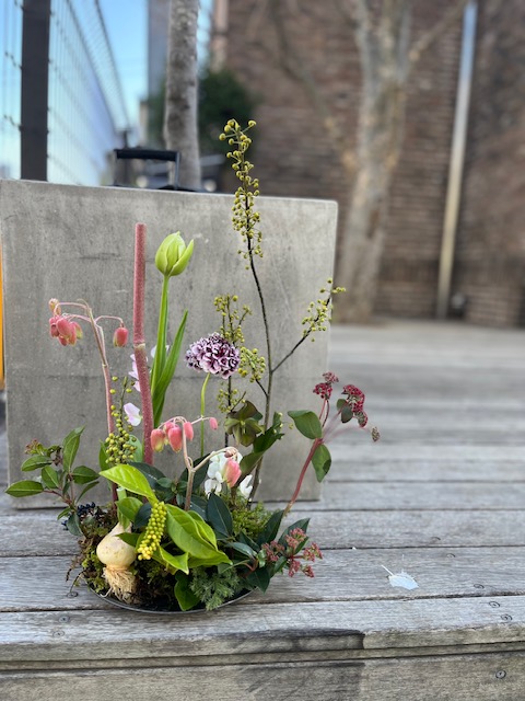 2026/02/03 春の花を飾りましょう MISUMIフラワースタジオのwork shop 生徒さん作品 球根付きチューリップ マツムシソウ(スカビオーサ) グリーンキャビア等を使って ハイコケを敷いてガーデン風に 早春のフラワーアレンジメント、球根、球根付きヒヤシンス、春のガーデンスタイル