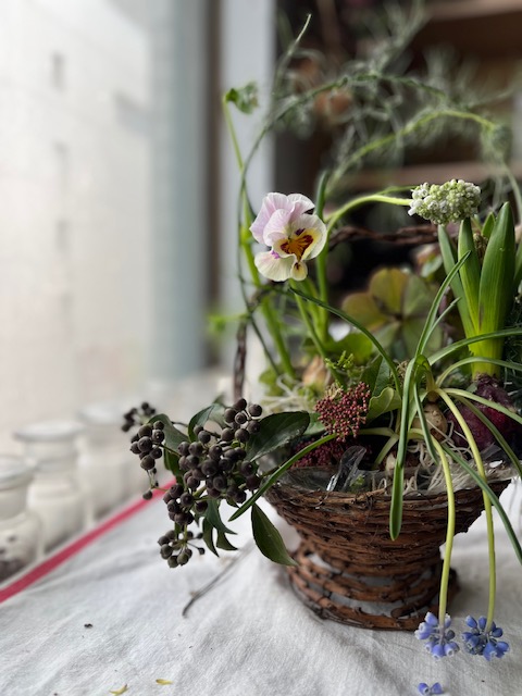 2026/03/06 MISUMIフラワースタジオ フラワーアレンジレッスン作品 生徒さん作品 バスケットアレンジ 球根付きフラワーを使ったデザイン カーブラインの葉をやわらかく 動きのあるデザイン パンジーの花がかわいい 早春のフラワーアレンジメント、球根、球根付きヒヤシンス、春のガーデンスタイル