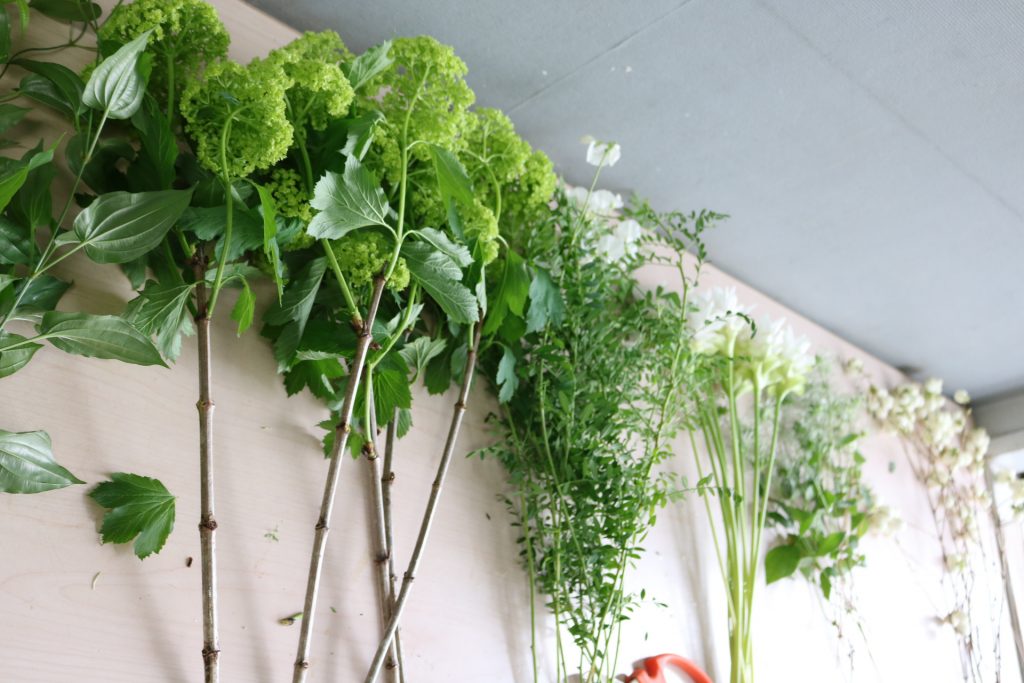 テーブルにすべてのブーケの素材を並べる