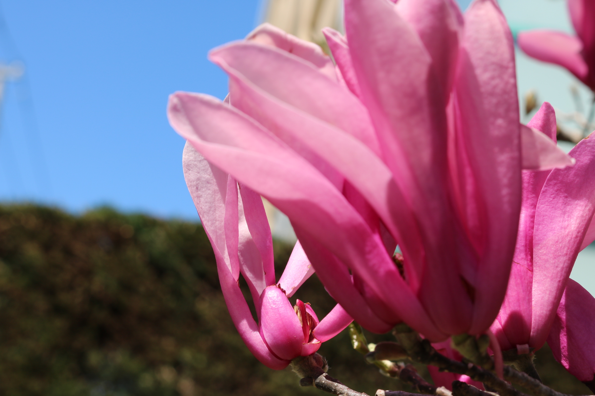 青い空に枝物の花が満開です